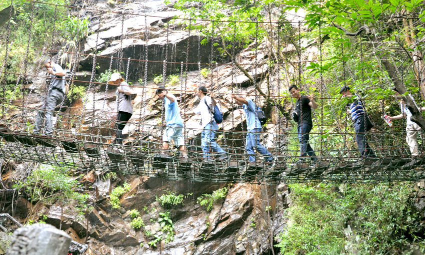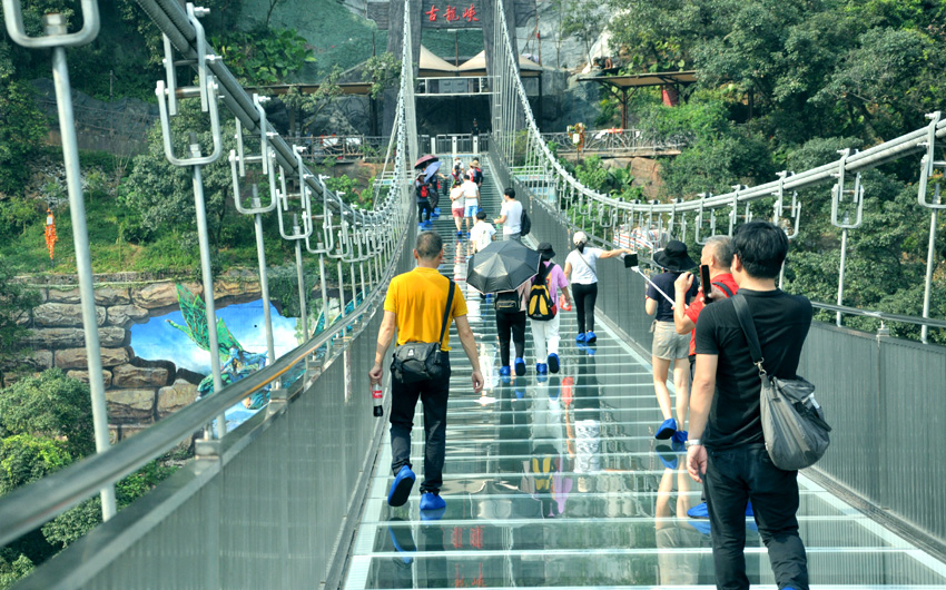 兩小時(shí)的小北江之游,大家都還余味未盡。導(dǎo)游又帶上大家趕往這次團(tuán)建活動(dòng)的重頭戲的目的地:古龍峽的“云天波霸”。今天公司參加團(tuán)建的所有員工都要挑戰(zhàn)目前世界上較寬的高空玻璃橋,玻璃橋像一條通體透明的巨龍連接著峽谷兩岸,橋下懸空超過100米,站在橋上向下看,真是令人心驚膽戰(zhàn),大家相互鼓勵(lì),三三兩兩牽手前行,用相互的關(guān)愛順利通過并成功抵達(dá)世界較大直徑的懸空玻璃平臺(tái)。盡管大家都汗流浹背,但每個(gè)人臉上都洋溢著喜悅。因?yàn)榇藭r(shí)大家都收獲了克服恐懼心理后戰(zhàn)勝困難的勇氣和成功!
