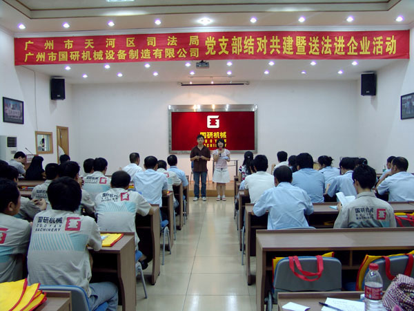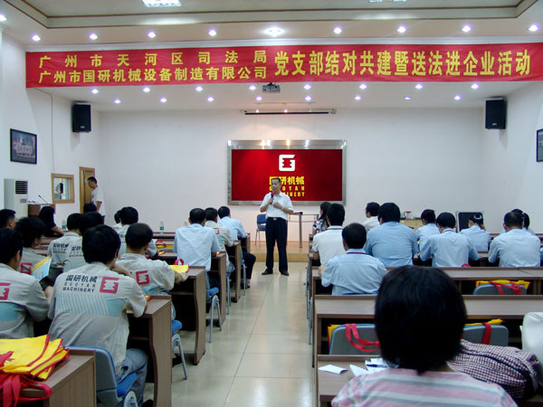 9月7日下午,廣州市天河區(qū)司法局黨支部和文教工作隊一行18人在局長羅育輝和副局長曾曉云的帶領下,來到廣州市國研機械設備制造有限公司舉行黨支部結對共建暨送法進企業(yè)活動。