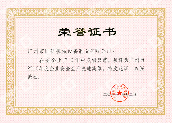 國研機械榮獲“廣州市2010年度企業安全生產先進集體”稱號