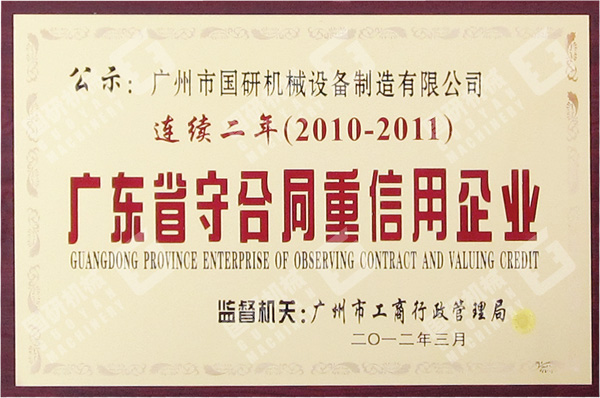 2012年3月,廣州市國研機(jī)械設(shè)備制造有限公司被評為2011年度“廣東省守合同重信用企業(yè)”。這是我司繼連續(xù)三年被評為“廣州市守合同重信用企業(yè)”之后,連續(xù)兩年獲此殊榮。